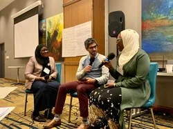 A woman in a beige headscarf and black blazer is speaking into a microphone during a presentation, with a projected slide showing Arabic script and English translations behind her. Seated audience members are visible, including a man with glasses and a long ponytail, and another man standing nearby.
